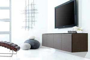 A well designed blend of cabinets and shelving keeps focal points on display while cleanly concealing wires to keep the family room looking organized.